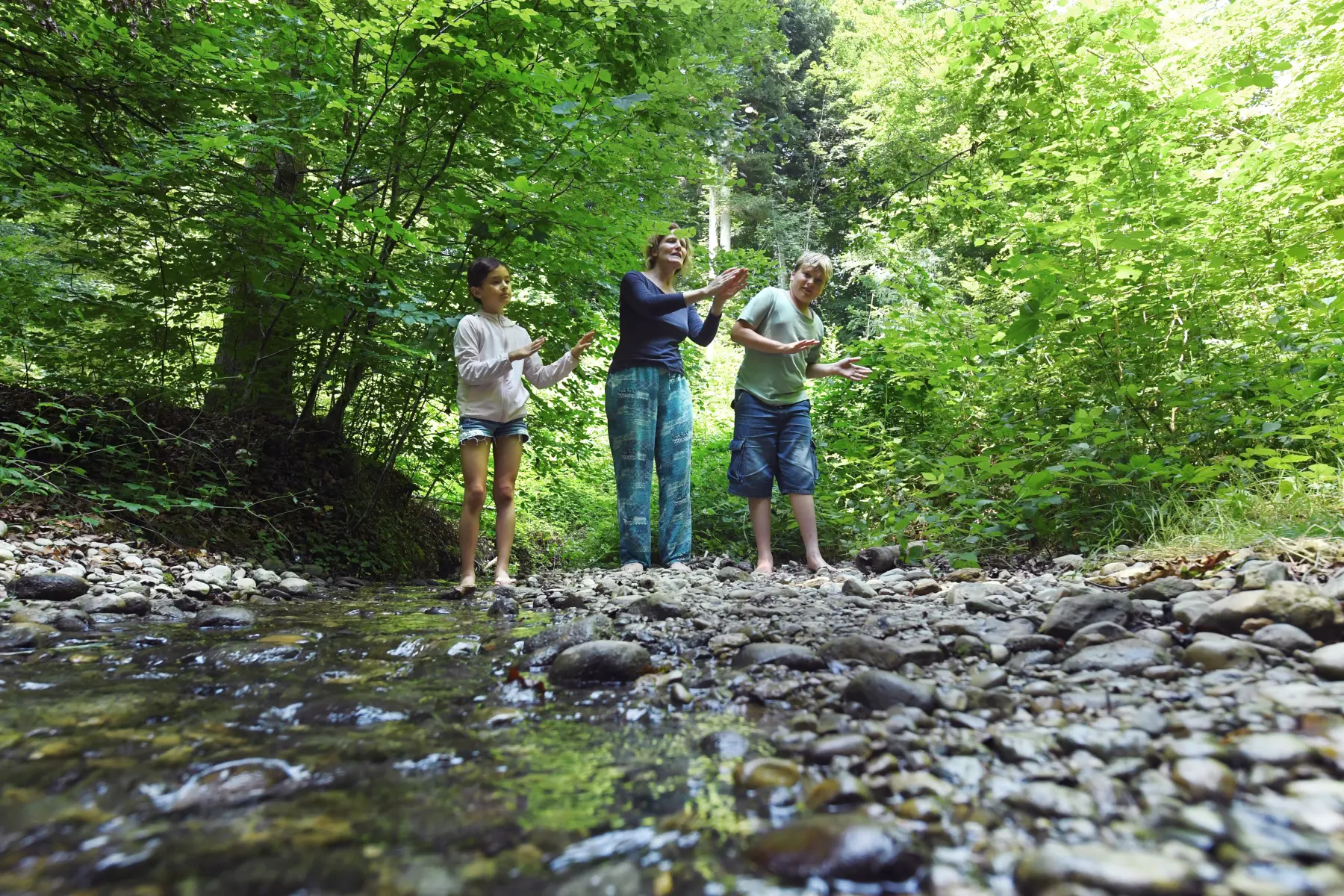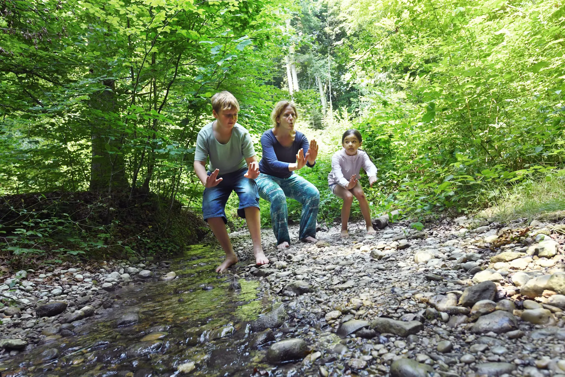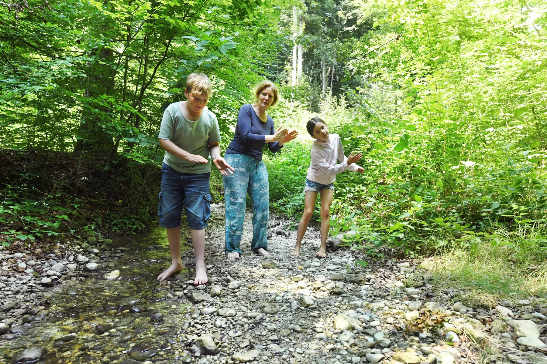 Die Spielleitung erzählt eine Geschichte, wie sich der Bach bewegt: "Wir sind ein Bach. Nun fliessen wir in eine Linkskurve... über eine