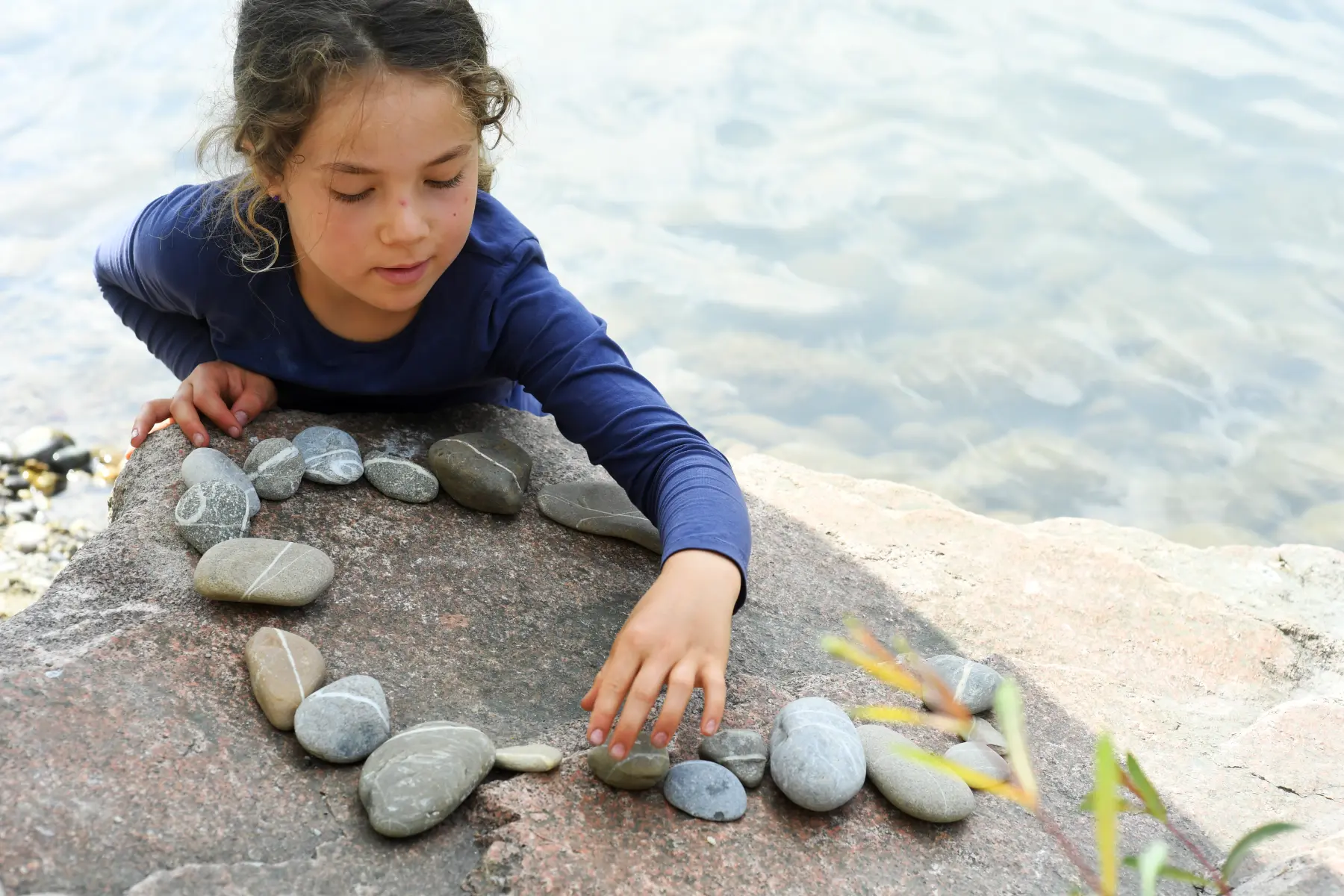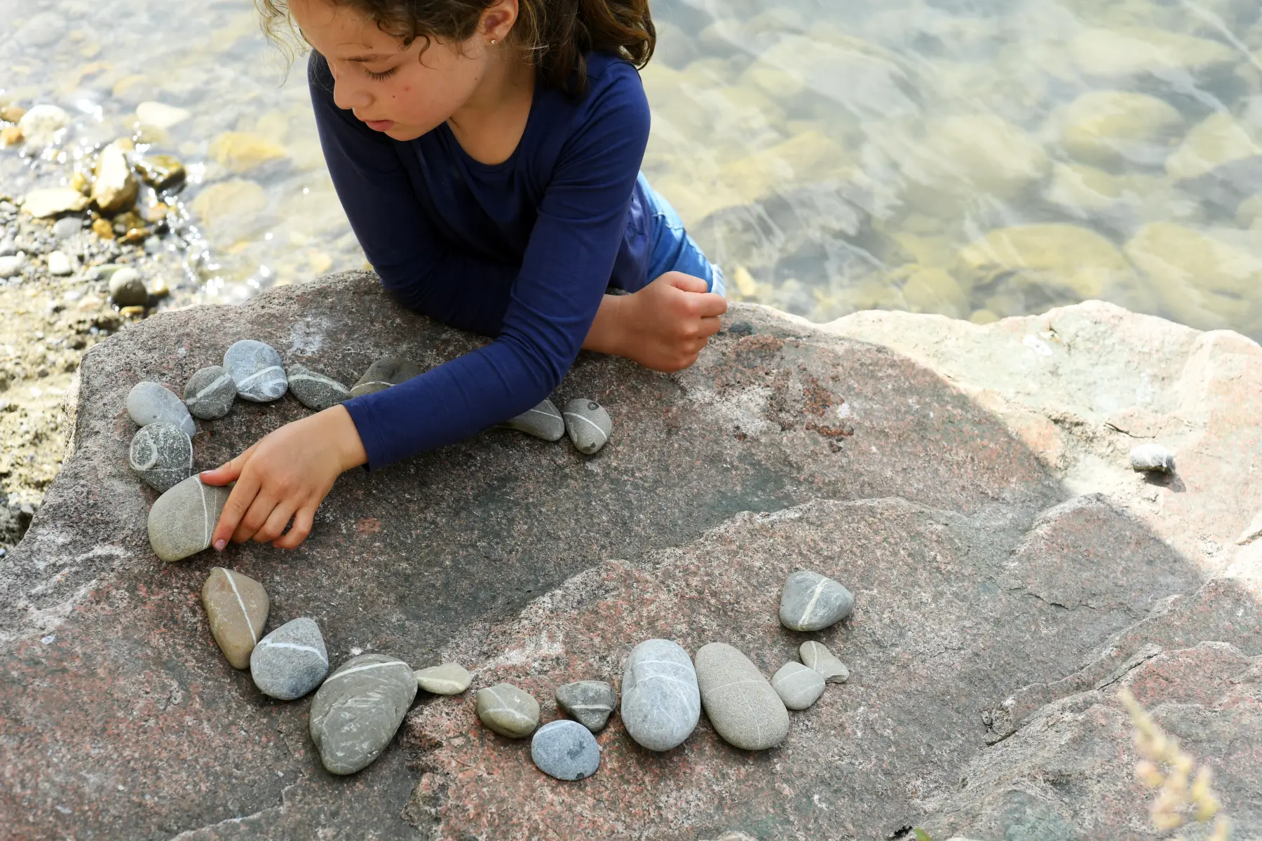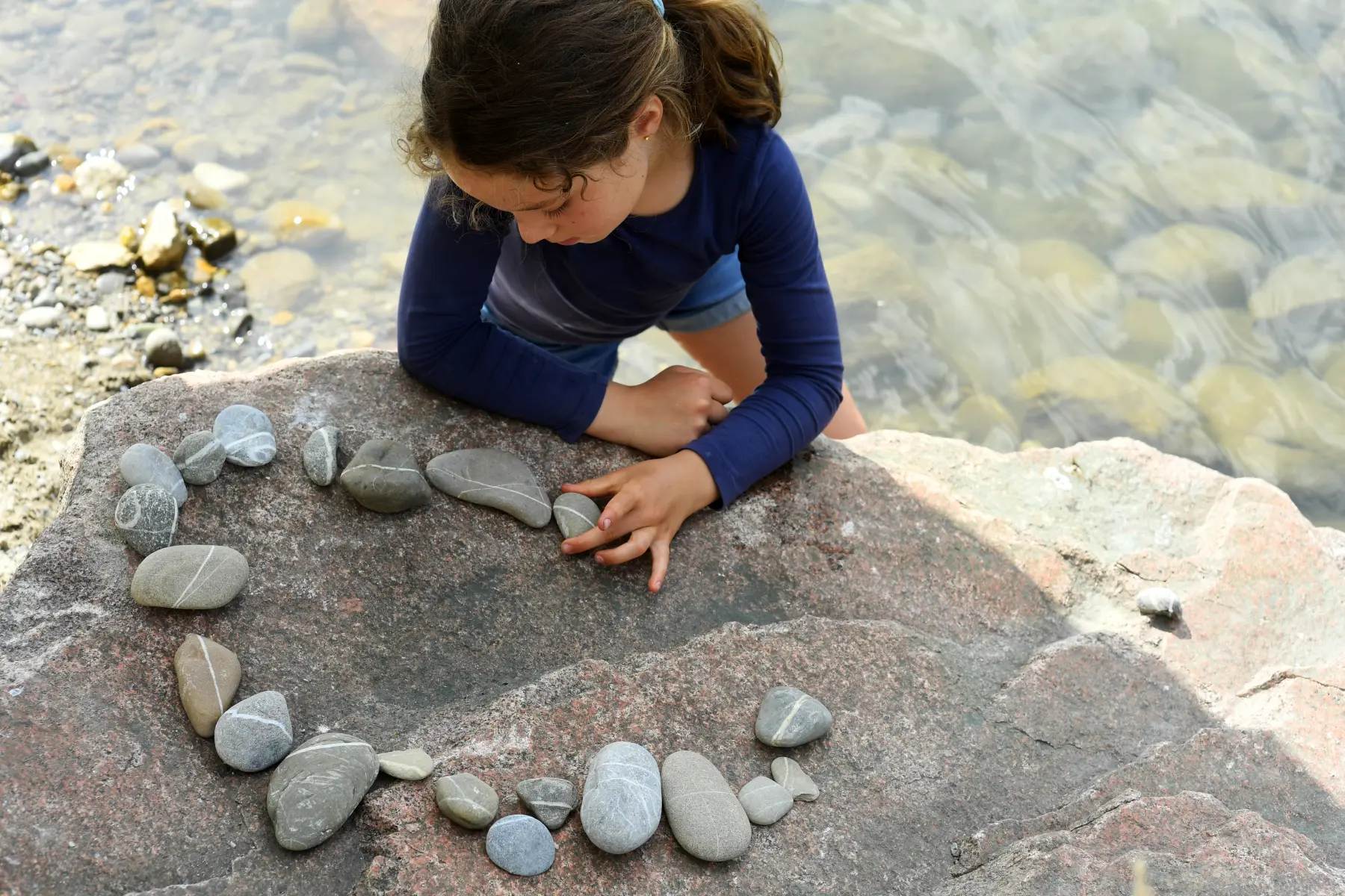 Wer legt die längste Kieselsteinstrasse auf die Erde oder auf einem farbigen Tuch? Viele Flusskiesel haben eine weisse Quarzader. Wer schafft es, die längste Linie (= Strasse) aus weissen Quarzadern zu legen?